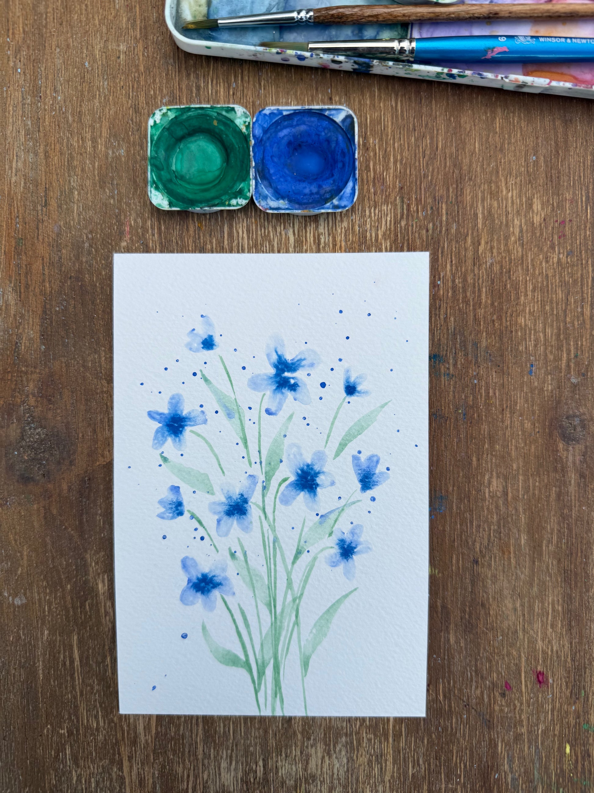 Bring a splash of whimsy to your walls with this playful blue flowers watercolor painting. Its cool, calming shades and lively brushstrokes capture the delicate beauty of blue blooms, perfect for sharing a touch of nature’s charm and cheer in any room.