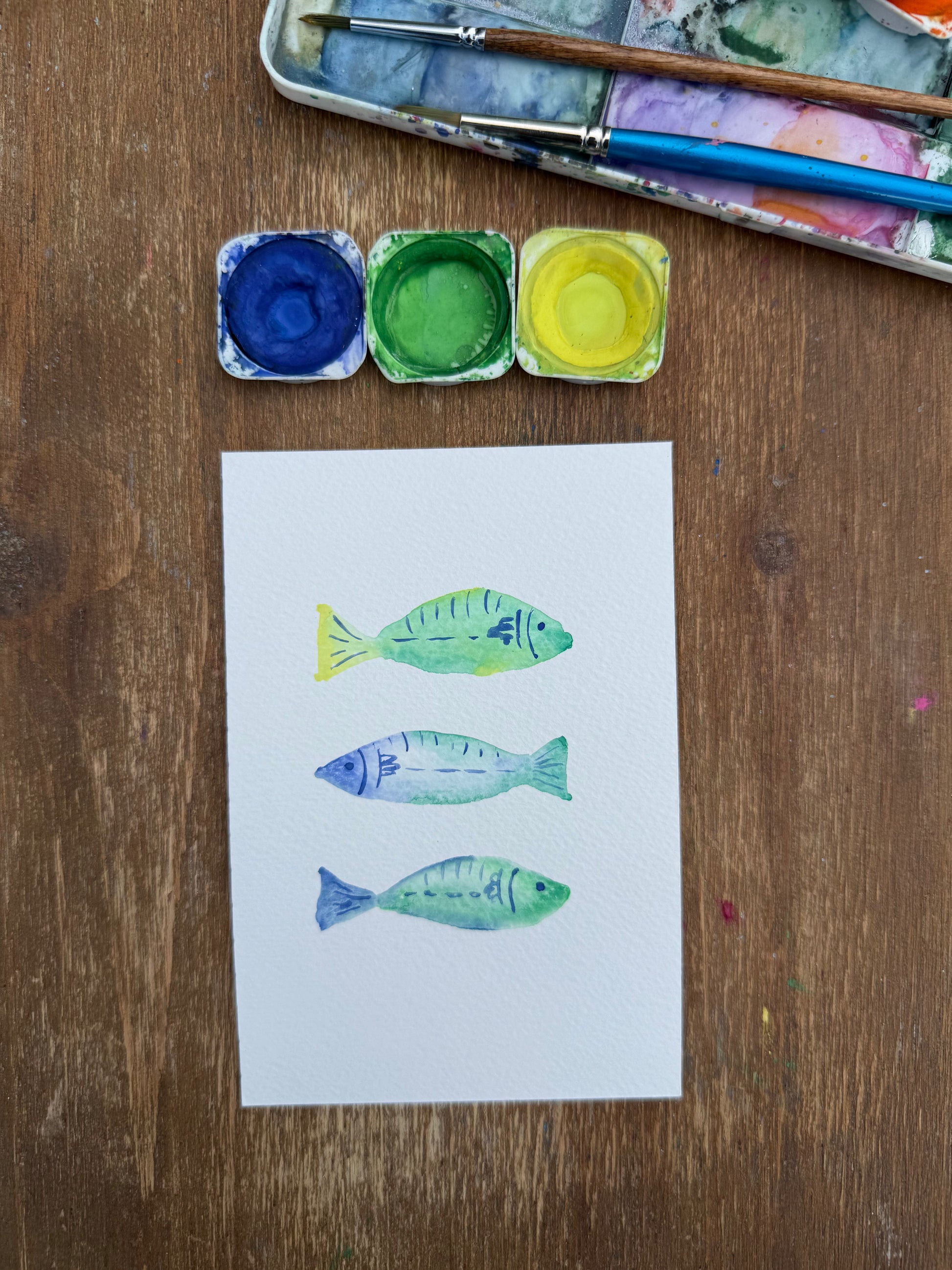 This original watercolor painting features three playful fish swimming with vibrant colors and lively brushstrokes. It’s a fun and cheerful way to add a splash of aquatic charm to any space.